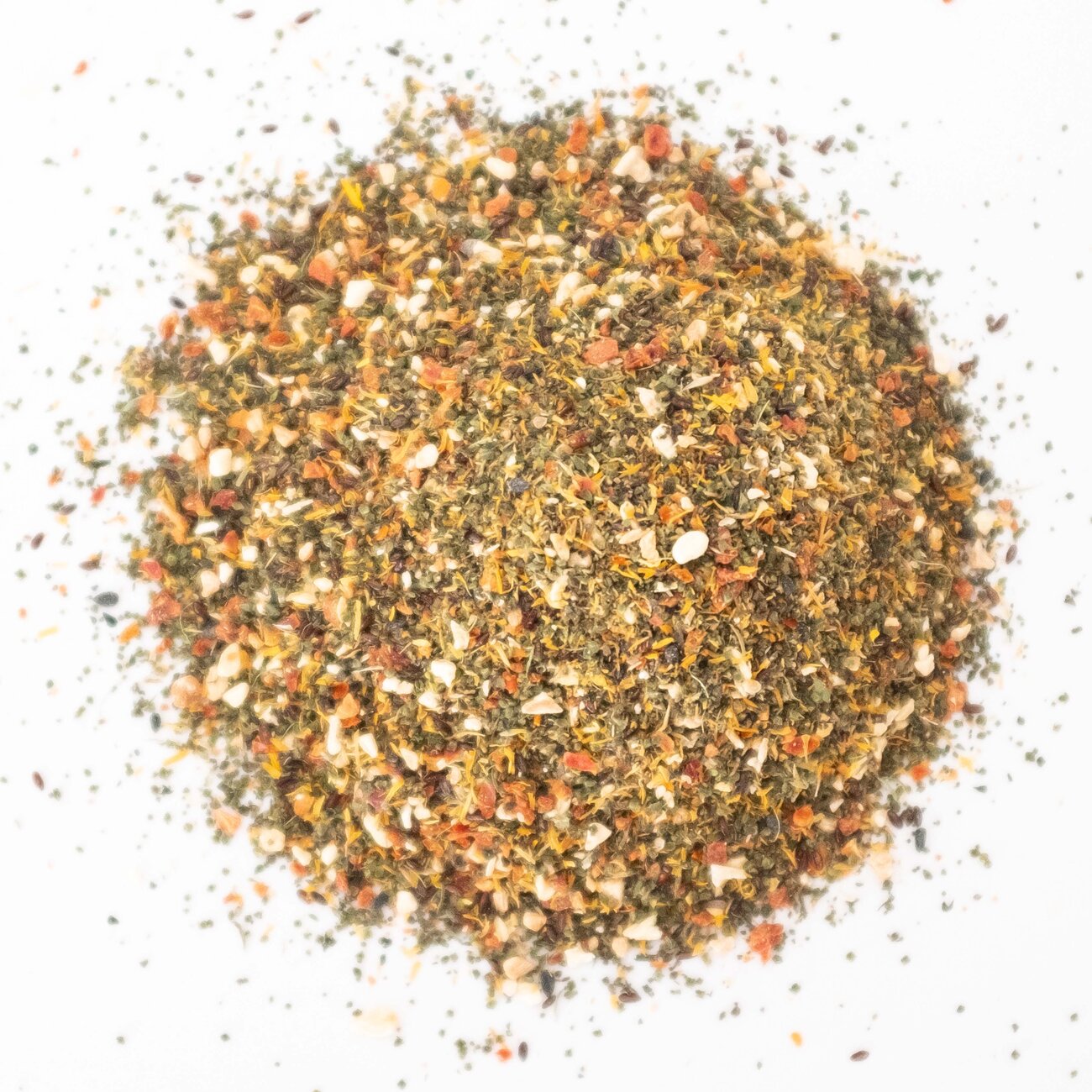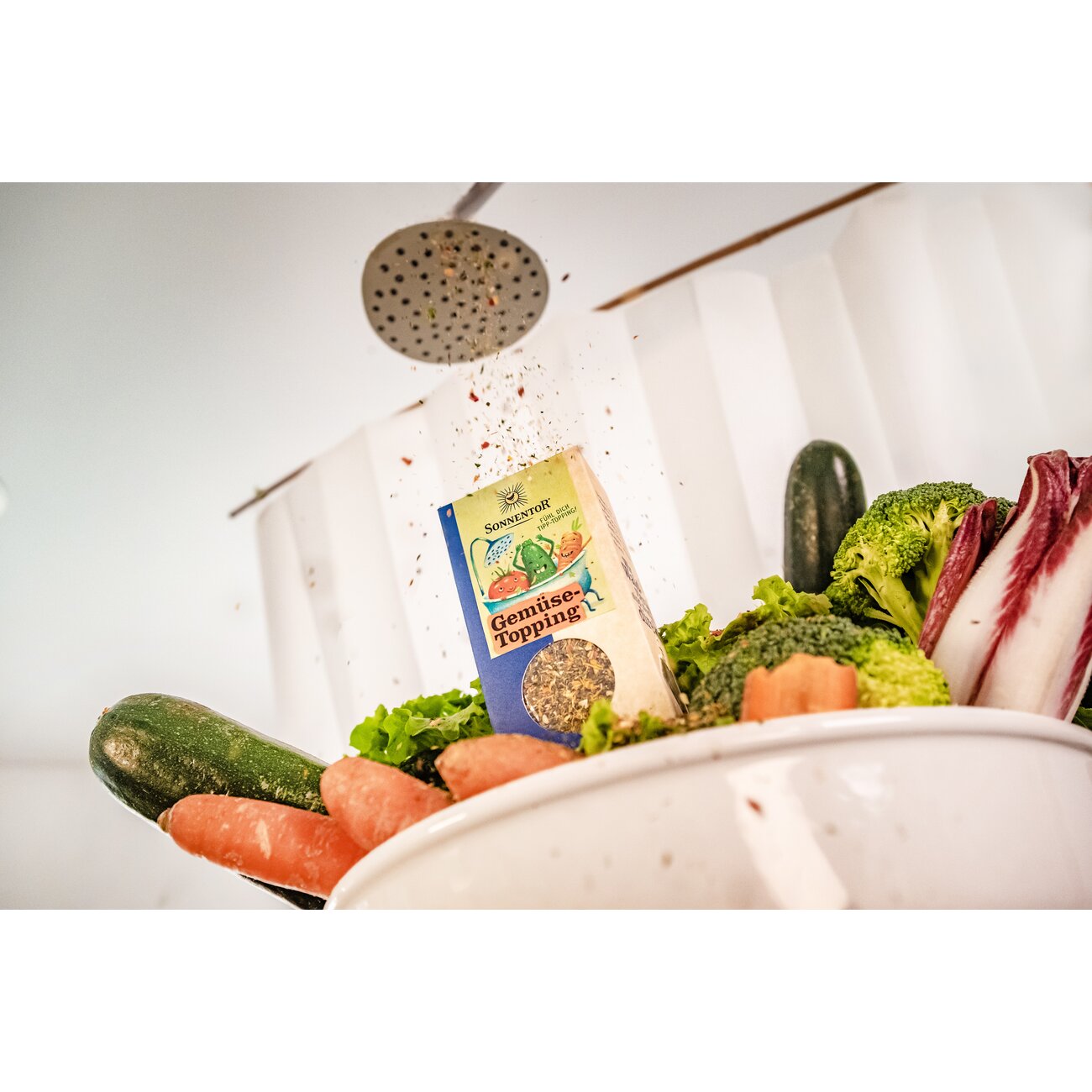 Du willst tipptopp Gemüse? Dann greif zu dieser Topping-Mischung mit feinen Gewürzen, Blüten und Samen. Einfach nach der Zubereitung über Gemüse, Hummus und vegane Gerichte streuen. Mit dieser würzigen Draufgabe gehen deine Lieblings-Gerichte garantiert nicht baden.