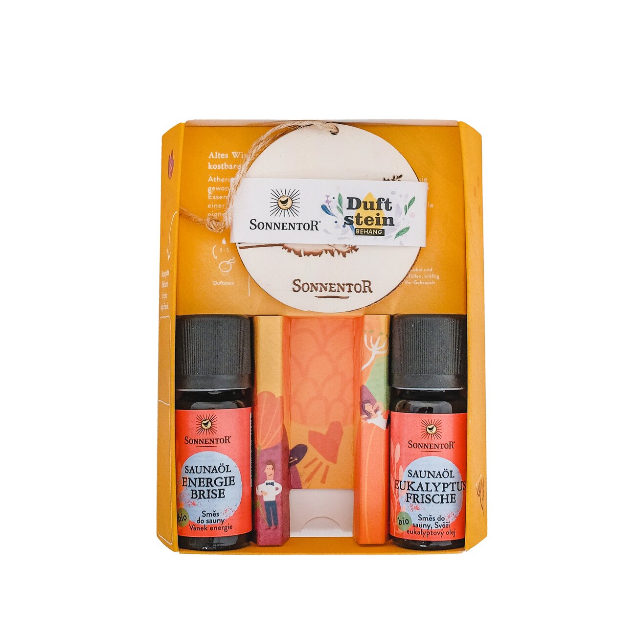 Content: Energy Breeze Sauna blend essential oil org. 10 ml, Eucalyptus-fresh Sauna blend essential oil org. 10 ml, Ceramic aroma diffuser. Size: 13,4 x 10,6 x 2,8, Only German version available
