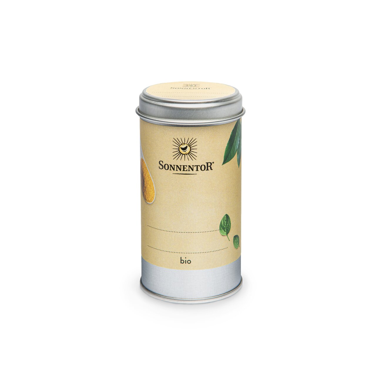 In the photo you can see a spice tin. The label is blank and has a dotted line where you can write on it.