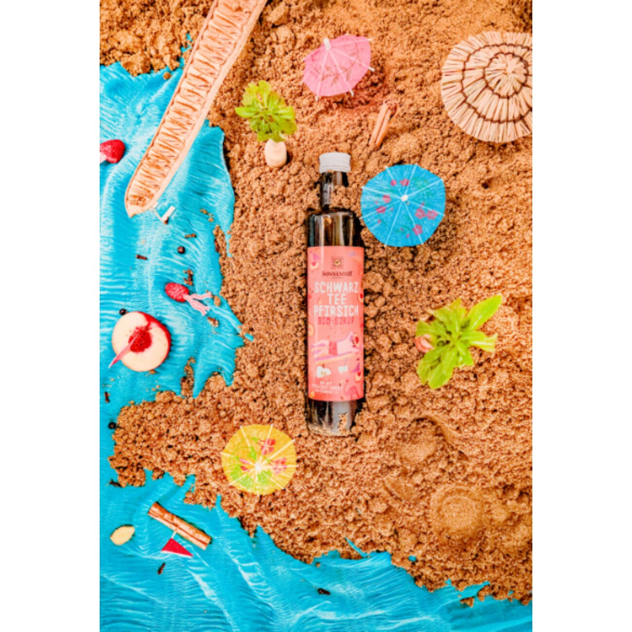 Ice, ice baby! This fruity syrup with black tea and sweet peach is perfect for a refreshing iced tea. Great for cooling off on hot days or for getting that summer feeling in winter. Peach on the beach! The syrup is sweetened only with apple juice concentrate.