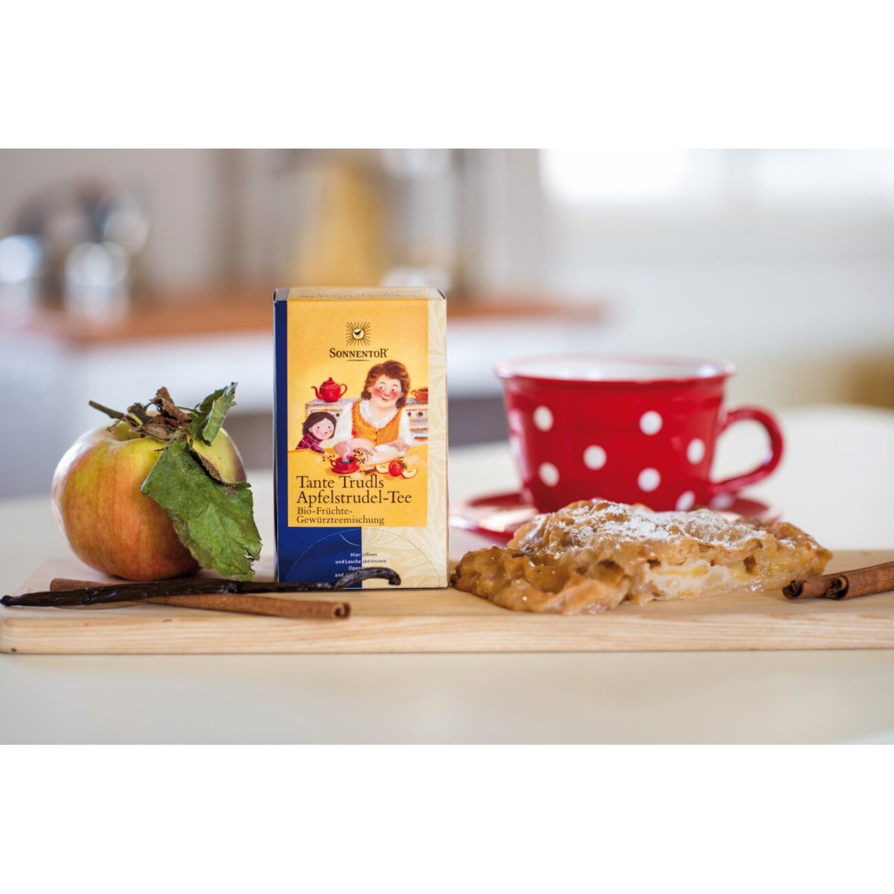 A wonderful scent of apple and cinnamon fills your nostrils the moment you step into Aunt Trudy's house. Her delicious crispy strudel tastes sweet and of spices, and we have captured precisely these aromas for you in this tea blend. You'll love this tea, especially when it's freezing cold outside. It goes wonderfully with fine desserts, fruit flan, biscuits, and, of course, apple strudel. Divine!