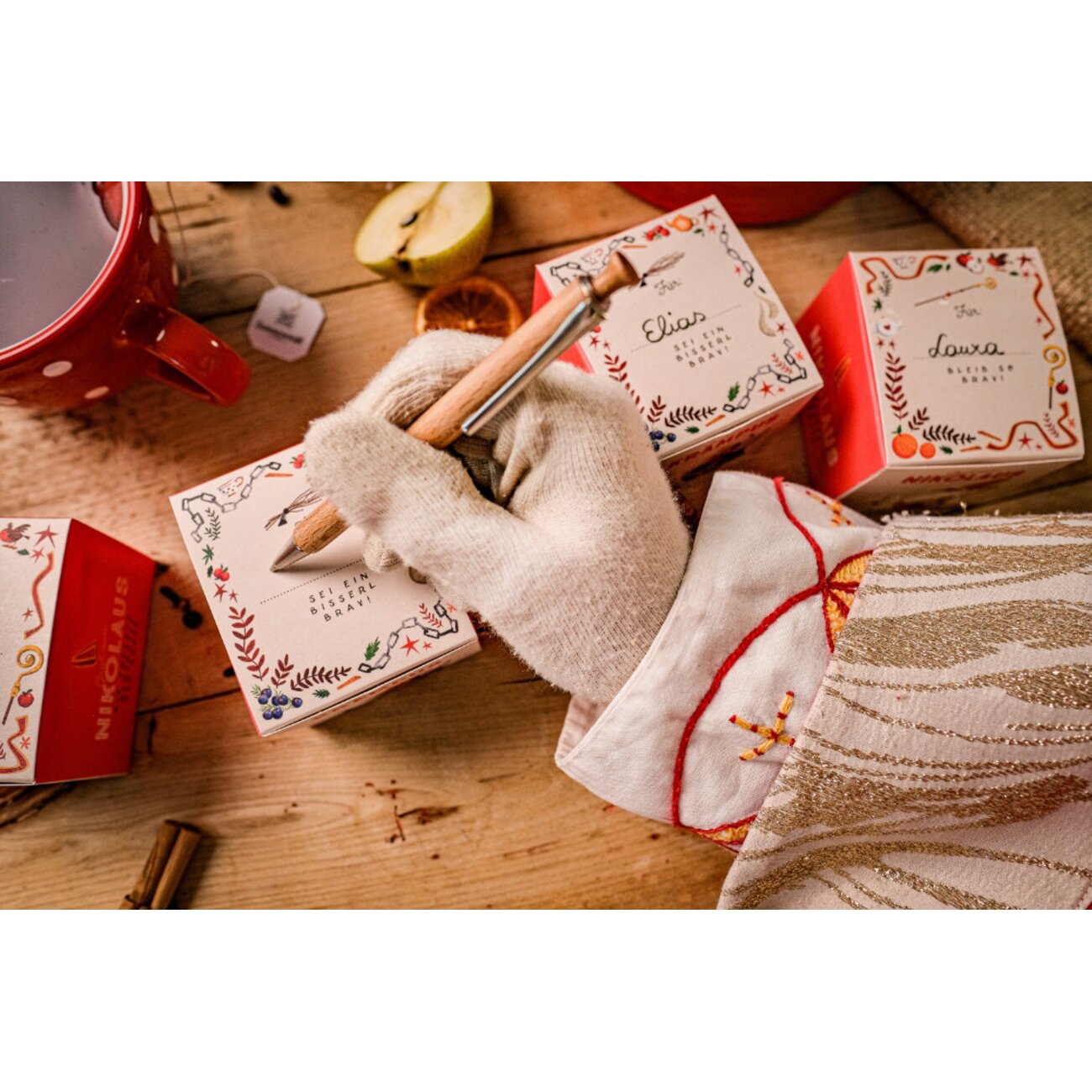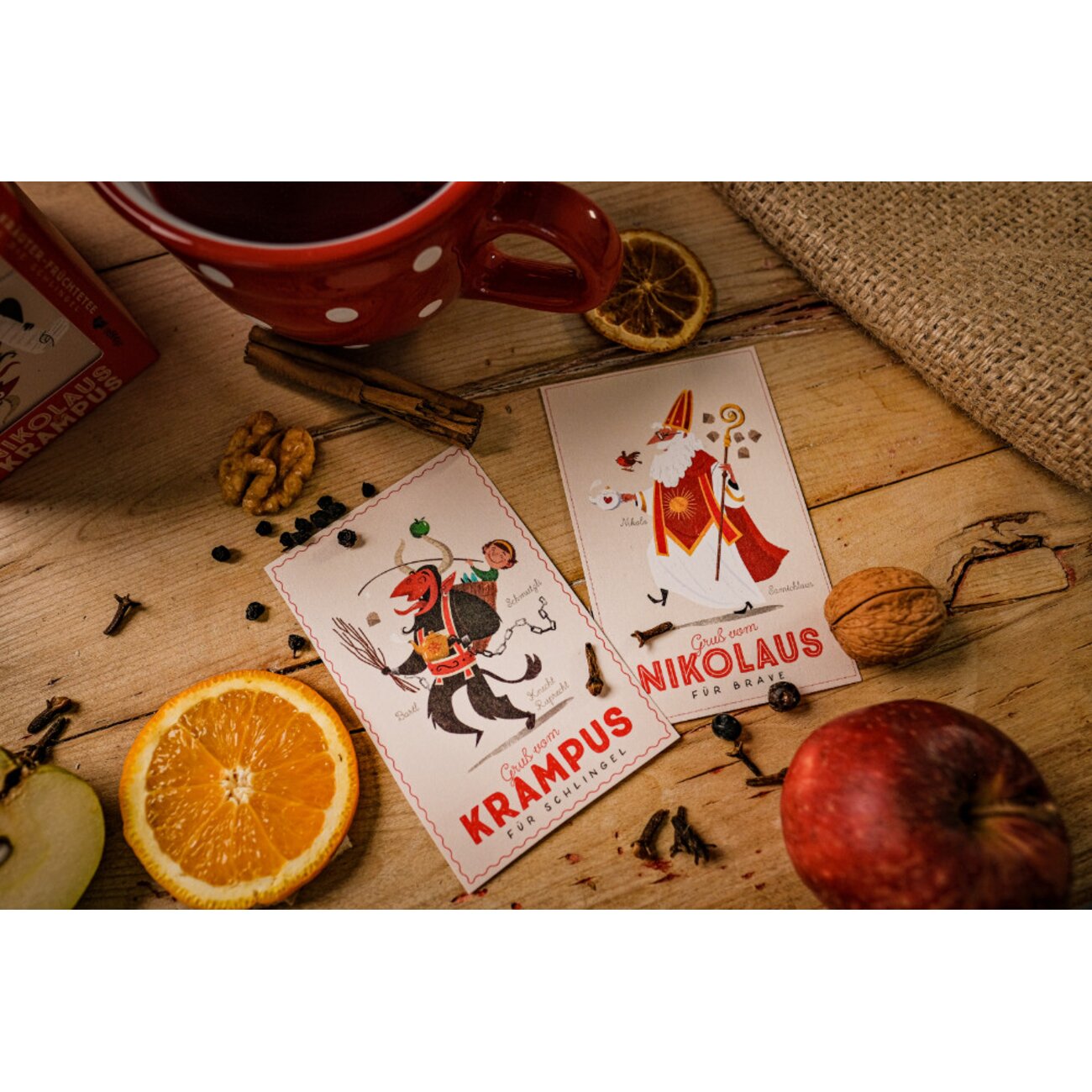 The delightful St.Nicholas & Krampus tea is the perfect pre-Christmas gift for young and old. The package includes greetings from Nicholas, the friendly bearer of gifts, and Krampus, his shaggy companion. You can send these greetings via a postcard that you can cut out or with the photo filter from your smartphone for personalised St. Nicholas/Krampus greetings: what fun!