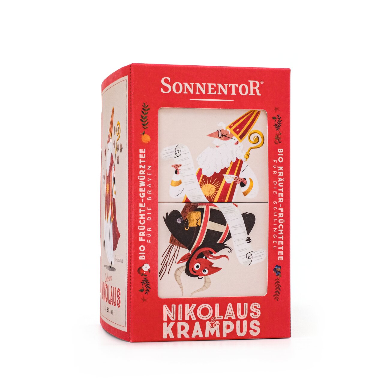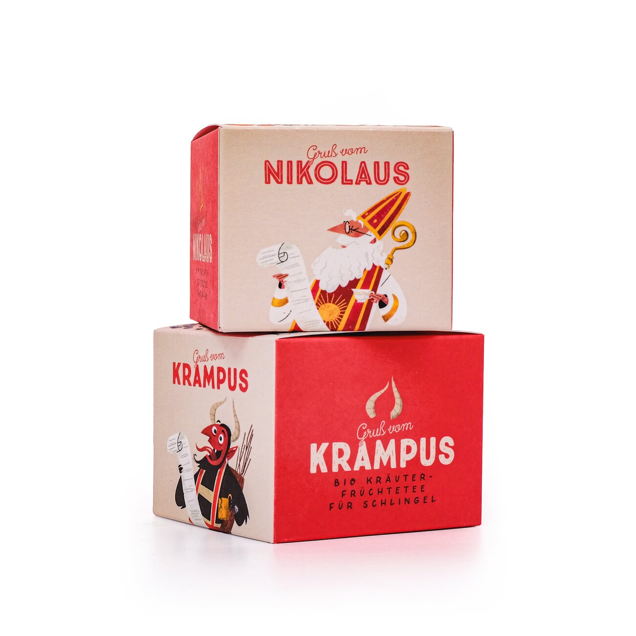 1 Box ST. NICHOLAS with 9 Teabags: apple pieces org. 23 %, hibiscus org., rose hip org., cinnamon org. 15 %, pears org., quince org., orange peels org. 4 %, cloves org., vanilla extract org.. 1 Box KRAMPUS with 9 Teabags: birch leaves org., camomile org., elderflowers org., cranberries org. 14 %, blueberries org. 11 %, stinging nettle org., rose hip org., cranberries (lingonberries) org. 5 %, juniper berries org..